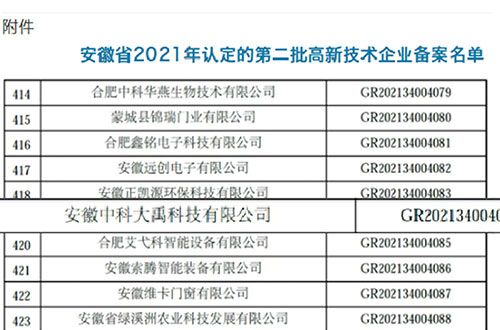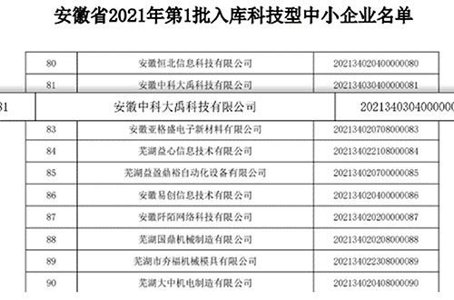 • 入選安徽省2021年第一批入庫科技型中小企業(yè)