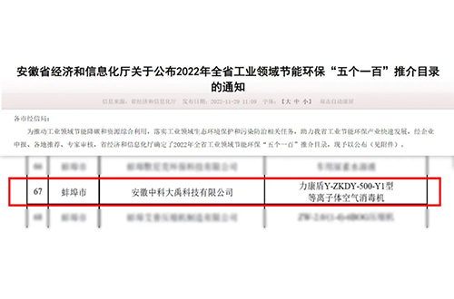 • 入選2023年全省工業(yè)領(lǐng)域節(jié)能環(huán)保“五個(gè)一百”推介目錄(節(jié)能環(huán)保新產(chǎn)品新裝備:G-ZKDY-2500-Y1型等離子體空氣消毒機(jī))